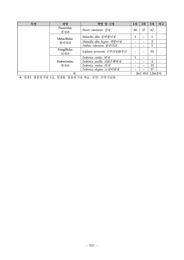 522 No. 학 명 국 명 1구간 2구간 3구간 4구간 5구간 6구간 7구간 8구간 9구간 무섬 마을 회룡 마을 전체 192 Molipteryx fuliginosa 큰허리노린재 2 2 Family Cydnidae 땅노린재과 193 Geotomus pygmaeus 애땅노린재 1 1 194 Macroscytus japonensis 땅노린재 1 1 2 Family Delphacidae 멸구과 195 Dicranotropis tikuzenensis 겨이삭멸구 1 1 1 2 1 2 8 196 Epeurysa nawaii 대멸구 3 1 12 1 2 1 2 4 26 197 Garaga nagaragawana 들판멸구 1 1 2 1 1 7 1 2 16 198 Hirozunka japonica 왕멸구 7 1 3 7 13 ...
