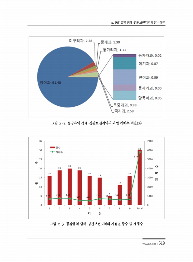x. 동강유역 생태·경관보전지역의 담수어류 www.nie.re.kr ?519 그림 ⅹ-2. 동강유역 생태·경관보전지역의 과별 개체수 비율 % 그림 ⅹ-3. 동강유역 생태·경관보전지역의 지점별 종수 및개체수