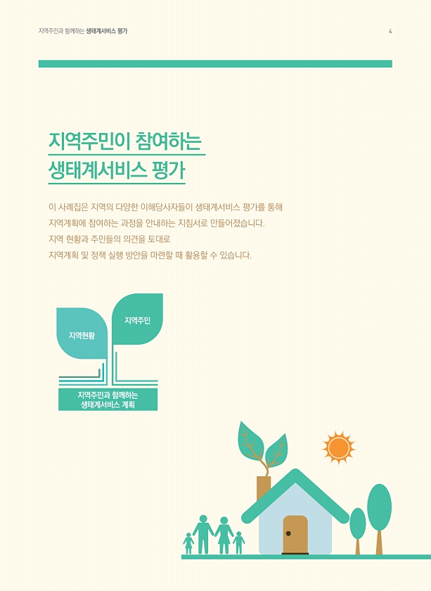 지역주민과 함께하는 생태계서비스 평가 4 지역주민이 참여하는 생태계서비스 평가 이 사례집은 지역의 다양한 이해당사자들이 생태계서비스 평가를 통해 지역계획에 참여하는 과정을 안내하는 지침서로 만들어졌습니다. 지역 현황과 주민들의 의견을 토대로 지역계획 및 정책 실행 방안을 마련할 때 활용할 수 있습니다. 지역주민과 함께하는 생태계서비스 계획 지역주민지역현황