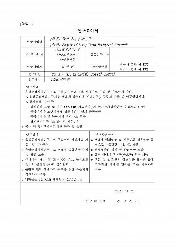 붙임 연구요약서 연구사업명 국문 국가장기생태연구 영문 수 행 부 서 기초생태연구본부 생태조사평가실 생태평가부 공동연구기관 연구책임자 김 남 신 참여연구원 내부 유승화 외 명 외부 조현제 외 명 연구기간 ? ? 개월 년 년 연구예산 백만원 연구개요 육상중점생태연구지소 구축 연구관리시설 생태자료 수집 및 자료연계 강화 육상중점생태연구지소 생태계 상호관계 시범연구 연구주제 발굴 및 연구방법개발 장기생태기반연구 생태타워 토양 및 대기 자료분석 차 국가장기생태연구 수집자료 대상 동북아시아 고산생태계 생물다양성 변화 공동연구 동북아시아 및 북한지역 생태자료 구축 장기생태연구지소 장기적 지형변화 국내 외 장기생태네트워크 구축 및 운영 연구성과 육상중점생태연구지소 구축으로 생태자료 자 동수집기반 구축 육상중점생태연구지소 ...