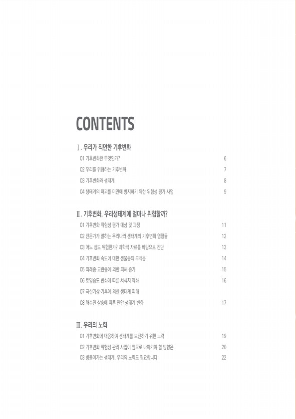 Ⅰ. 우리가 직면한 기후변화 01 기후변화란 무엇인가? 6 02 우리를 위협하는 기후변화 7 03 기후변화와 생태계 8 04 생태계의 파괴를 미연에 방지하기 위한 위험성 평가 사업 9 Ⅱ. 기후변화, 우리생태계에 얼마나 위험할까? 01 기후변화 위험성 평가 대상 및 과정 11 02 전문가가 말하는 우리나라 생태계의 기후변화 영향들 12 03 어느 정도 위험한가? 과학적 자료를 바탕으로 진단 13 04 기후변화 속도에 대한 생물종의 부적응 14 05 외래종·교란종에 의한 피해 증가 15 06 토양습도 변화에 따른 서식지 약화 16 07 극한기상·기후에 의한 생태계 피해 08 해수면 상승에 따른 연안 생태계 변화 17 Ⅲ. 우리의 노력 01 기후변화에 대응하여 생태계를 보전하기 위한 노력 19 02 기후변화 위...