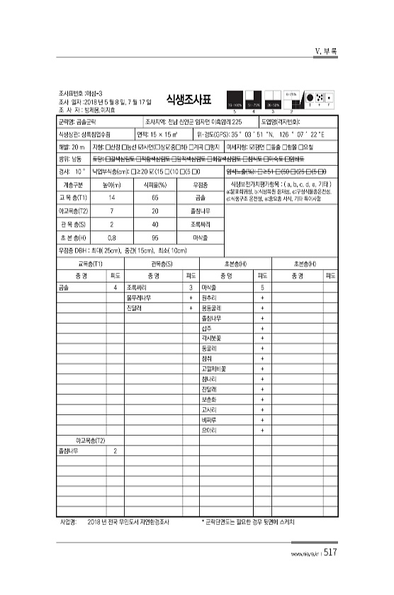V. 부 록 www.nie.re.kr ?517 조사표번호 매섬-3 조사 일자 2018 년 5 월 8 일, 7 월 17 일 조 사 자 방제용,이지효 식생조사표 군락명곰솔군락 조사지역전남 신안군 임자면 이흑암리 225 도엽명 격자번호 식생상관상록침엽수림 면적15 × 15 ㎡ 위·경도 GPS 35 ° 03 ′ 51 ″N, 126 ° 07 ′ 22 ″E 해발20 m 지형□산정 □능선 ?사면 ?상?중□하 □계곡 □평지 미세지형?평면 □돌출 □함몰 □요철 방위남동 토양□갈색삼림토 □적황색삼림토 □암적색삼림토 □회갈색삼림토 □침식토 □미숙토 □암쇄토 경사10 ° 낙엽부식층 cm □≥20 ? 15 □ 10 □ 5 □0 암석노출 % □≥51 □〈50 □〈25 □〈5 □0 계층구분 높이 m 식피율 % 우점종 식생보전가치평가항...