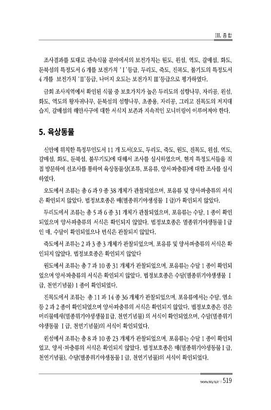III. 종 합 www.nie.re.kr ?519 조사결과를 토대로 관속식물 분야에서의 보전가치는 원도, 왼섬, 역도, 갈매섬, 화도, 둔북섬의 특정도서 6 개를 보전가치 ‘Ⅰ’등급, 두리도, 죽도, 진목도, 불기도의 특정도서 4 개를 보전가치 ‘Ⅱ’등급, 나머지 오도는 보전가치 Ⅲ‘등급으로 평가하였다. 금회 조사지역에서 확인된 식물 중 보호가치가 높은 두리도의 섬향나무, 자리공, 왼섬, 화도, 역도의 왕자귀나무, 둔북섬의 섬향나무, 초종용, 자리공, 그리고 진목도의 저지대 습지, 갈매섬의 해안사구에 대한 서식지 보존과 지속적인 모니터링이 이루어져야 한다. 5. 신안에 위치한 특정무인도서 11 개 도서 오도, 두리도, 죽도, 원도, 진목도, 왼섬, 역도, 갈매섬, 화도, 둔북섬, 불무기도 에 대해서 조사를 ...
