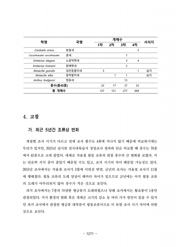 1271 4. 고찰 가. 최근 5년간 조류상 변화 계절별 조사 시기가 다르고 전체 조사 횟수도 4회에 지나지 않기 때문에 비교하기에는 무리가 있지만, 2015년 실시된 전국내륙습지 정밀조사 결과와 단순 비교할 때 종수는 70종 에서 45종으로 크게 줄었다. 대체로 겨울철 월동 조류의 관찰 종수의 큰 변화를 보였다. 이 는 단순히 서식 종이 줄었기 때문일 수도 있고, 조사 시기의 차이 때문일 가능성도 있다. 2015년 조사에서는 겨울철 조사가 2월에 이뤄진 반면, 금년의 조사는 겨울철 조사가 11월 에 행해졌다. 월동 조류의 도래 양상이 해마다 차이가 있으므로 금년에는 아직 월동 조류 의 도래가 마무리되지 않아 종수가 적은 것으로 보인다. 과거 조사에서는 7종의 다양한 맹금류가 도래하였으나 당해 조사에서는 황...