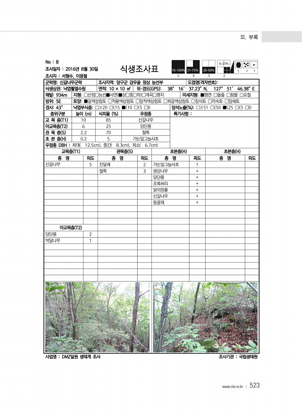 Ⅲ. 부록 www.nie.re.kr ? 523 No 8 조사일자 2016년 8월 30일 조사자 서형수, 이응필 식생조사표 군락명신갈나무군락 조사지역양구군 감우골 정상 능선부 도엽명 격자번호 식생상관낙엽활열수림 면적10 × 10 ㎡ 위·경도 GPS 38° 16′ 37.23″N, 127° 51′ 46.38″E 해발934m 지형□산정□능선■사면 ■상□중□하 □계곡□평지 미세지형■평면 □돌출 □함몰 □요철 방위SE 토양■갈색삼림토 □적황색삼림토 □암적색삼림토 □회갈색삼림토 □침식토 □미숙토 □암쇄토 경사43° 낙엽부식층□≥20 □ 15 ■ 10 □ 5 □0 암석노출 % □≥51 □ 50 ■ 25 □ 5 □0 층위구분 높이 m 식피율 % 우점종 특기사항 교 목 층 T1 10 85 신갈나무 아교목층 T2 6 25 당단...