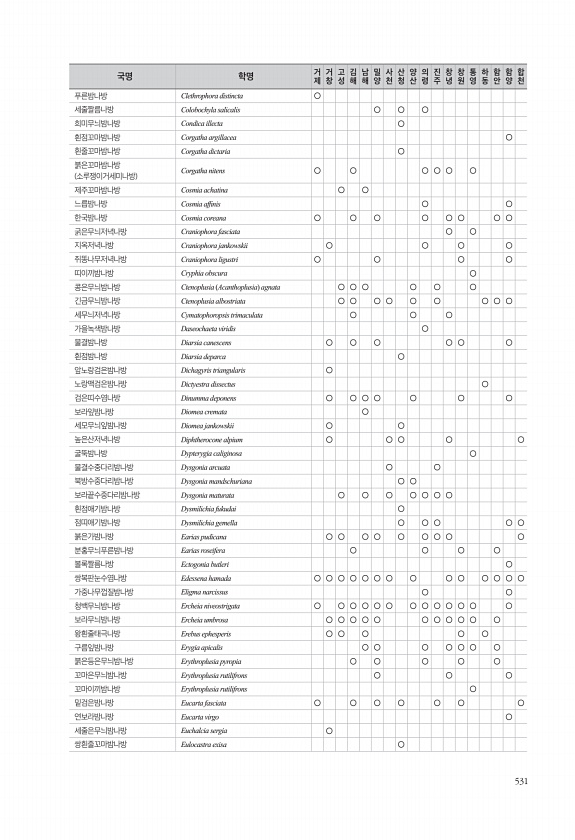 531 푸른밤나방 Clethrophora distincta ○ 세줄짤름나방 Colobochyla salicalis ○ ○ ○ 희미무늬밤나방 Condica illecta ○ 흰점꼬마밤나방 Corgatha argillacea ○ 흰줄꼬마밤나방 Corgatha dictaria ○ 붉은꼬마밤나방 소루쟁이거세미나방 Corgatha nitens ○ ○ ○ ○ ○ ○ 제주꼬마밤나방 Cosmia achatina ○ ○ 느릅밤나방 Cosmia affnis ○ ○ 한국밤나방 Cosmia coreana ○ ○ ○ ○ ○ ○ ○ ○ 굵은무늬저녁나방 Craniophora fasciata ○ ○ 지옥저녁나방 Craniophora jankowskii ○ ○ ○ ○ 쥐똥나무저녁나방 Craniophora ligustri ○ ○ ○ ○ 띠...