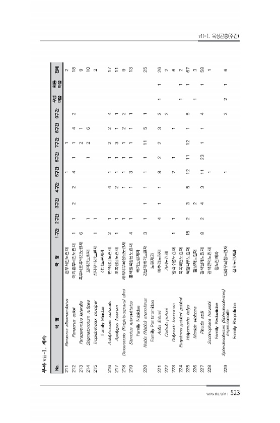 523 No. 학 명 국 명 1구간 2구간 3구간 4구간 5구간 6구간 7구간 8구간 9구간 무섬 마을 회룡 마을 전체 211 Panaorus albomaculatus 흰무늬긴노린재 1 1 2 212 Panaorus csikii 어리흰무늬긴노린재 1 1 2 2 4 1 1 4 2 18 213 Paraparomius lateralis 측무늬표주박긴노린재 6 2 1 9 214 Stigmatonotum rufipes 꼬마긴노린재 1 1 2 6 10 215 Tropidothorax cruciger 십자무늬긴노린재 1 1 2 Family Miridae 장님노린재과 216 Adelphocoris suturalis 변색장님노린재 2 1 4 1 1 2 2 4 17 217 Apolygus lucorum 초록장님노린재 1 1 ...