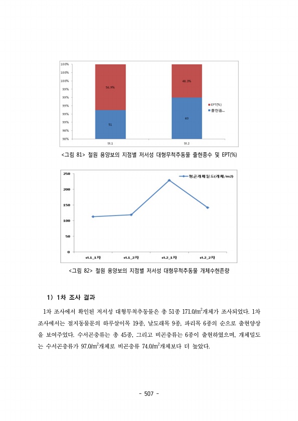507 그림 81 철원 용양보의 지점별 저서성 대형무척추동물 출현종수 및 EPT % 그림 82 철원 용양보의 지점별 저서성 대형무척추동물 개체수현존량 1차 조사에서 확인된 저서성 대형무척추동물은 총 종 51 171.0/m2개체가 조사되었다 차 1 조사에서는 절지동물문의 하루살이목 종 날도래목 종 파리목 종의 순으로 출현양상 19 , 9 , 6 을 보여주었다 수서곤충류는 총 종 그리고 비곤충류는 종이 출현하였으며 개체밀도 45 , 6 , 는 수서곤충류가 97.0/m2개체로 비곤충류 74.0/m2개체보다 더높았다.