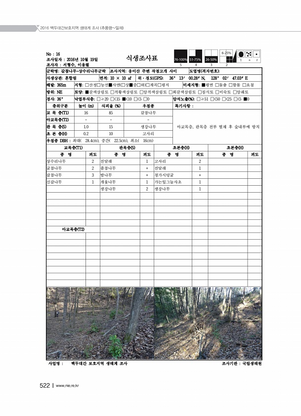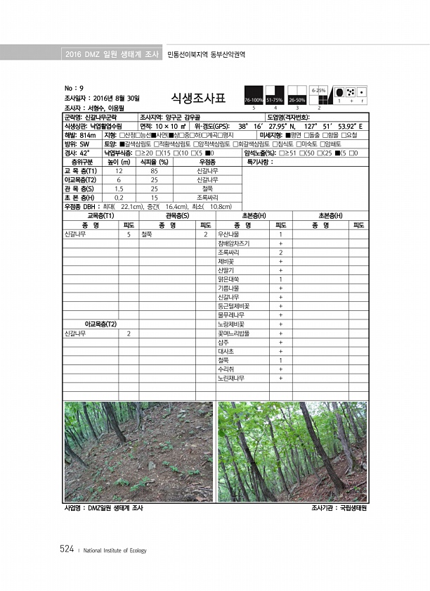 2016 DMZ 일원 생태계 조사 민통선이북지역 동부산악권역 524 ? National Institute of Ecology No 9 조사일자 2016년 8월 30일 조사자 서형수, 이응필 식생조사표 군락명신갈나무군락 조사지역양구군 감우골 도엽명 격자번호 식생상관낙엽활엽수림 면적10 × 10 ㎡ 위·경도 GPS 38° 16′ 27.95″N, 127° 51′ 53.92″E 해발814m 지형□산정□능선■사면 ■상□중□하 □계곡□평지 미세지형■평면 □돌출 □함몰 □요철 방위SW 토양■갈색삼림토 □적황색삼림토 □암적색삼림토 □회갈색삼림토 □침식토 □미숙토 □암쇄토 경사42° 낙엽부식층□≥20 □ 15 □ 10 □ 5 ■0 암석노출 % □≥51 □ 50 □ 25 ■ 5 □0 층위구분 높이 m 식피율 % 우점종 특기사...