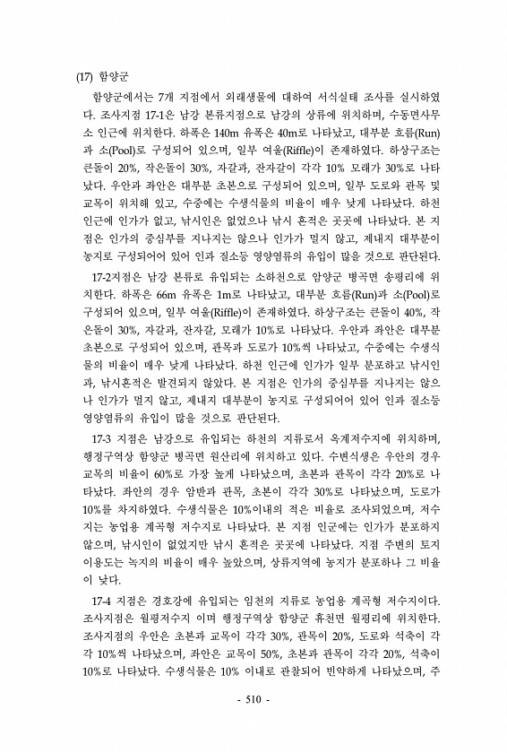 17 함양군 함양군에서는 7개 지점에서 외래생물에 대하여 서식실태 조사를 실시하였 다. 조사지점 17-1은 남강 본류지점으로 남강의 상류에 위치하며, 수동면사무 소 인근에 위치한다. 하폭은 140m 유폭은 40m로 나타났고, 대부분 흐름 Run 과 소 Pool 로 구성되어 있으며, 일부 여울 Riffle 이 존재하였다. 하상구조는 큰돌이 20%, 작은돌이 30%, 자갈과, 잔자갈이 각각 10% 모래가 30%로 나타 났다. 우안과 좌안은 대부분 초본으로 구성되어 있으며, 일부 도로와 관목 및 교목이 위치해 있고, 수중에는 수생식물의 비율이 매우 낮게 나타났다. 하천 인근에 인가가 없고, 낚시인은 없었으나 낚시 흔적은 곳곳에 나타났다. 본 지 점은 인가의 중심부를 지나지는 않으나 인가가 멀지 않고, 제내지 대부...