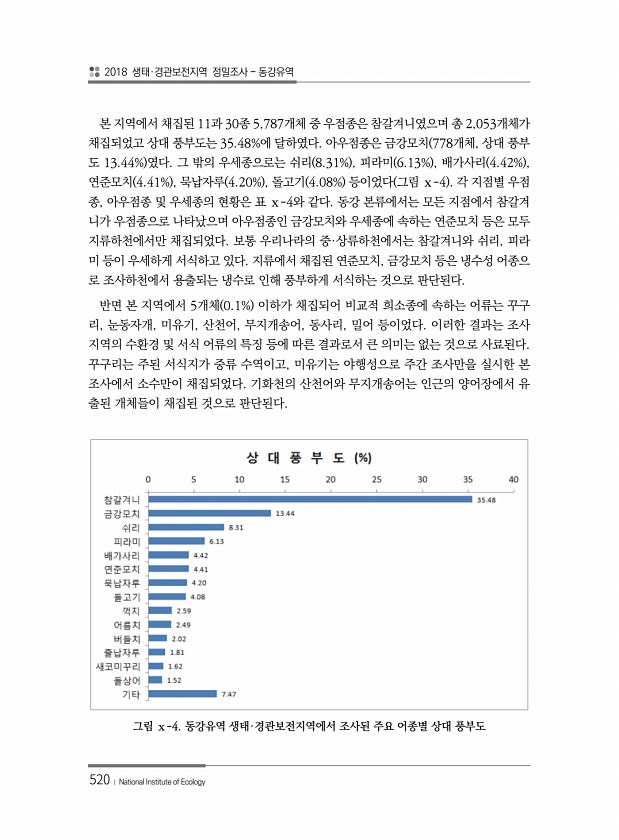 2018 생태·경관보전지역 정밀조사 동강유역 520 ? National Institute of Ecology 본 지역에서 채집된 11과 30종 5,787개체 중 우점종은 참갈겨니였으며 총 2,053개체가 채집되었고 상대 풍부도는 35.48%에 달하였다. 아우점종은 금강모치 778개체, 상대 풍부 도 13.44% 였다. 그 밖의 우세종으로는 쉬리 8.31% , 피라미 6.13% , 배가사리 4.42% , 연준모치 4.41% , 묵납자루 4.20% , 돌고기 4.08% 등이었다 그림 ⅹ-4 각 지점별 우점 종, 아우점종 및 우세종의 현황은 표 ⅹ-4와 같다. 동강 본류에서는 모든 지점에서 참갈겨 니가 우점종으로 나타났으며 아우점종인 금강모치와 우세종에 속하는 연준모치 등은 모두 지류하천에서만 채집되었다. 보통 ...