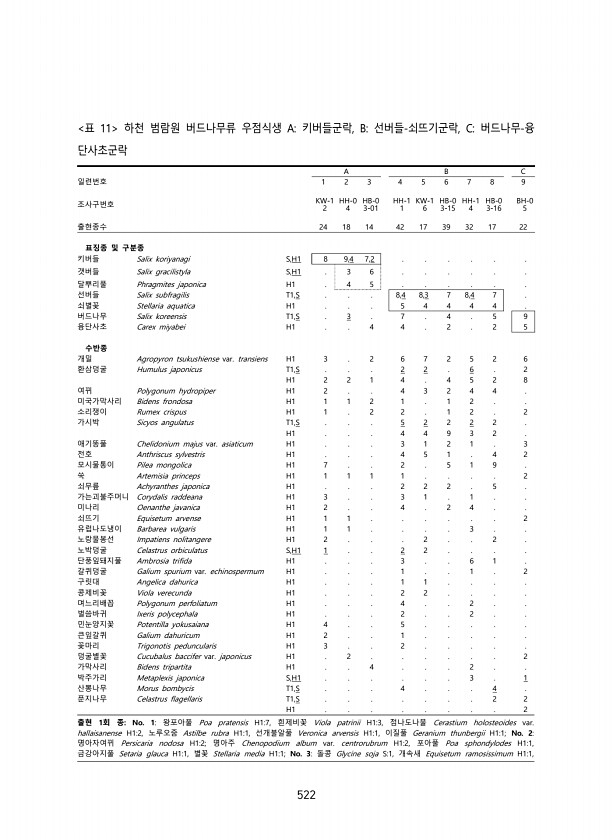 522 A B C 일련번호 1 2 3 4 5 6 7 8 9 조사구번호 KW-1 2 HH-0 4 HB-0 3-01 HH-1 1 KW-1 6 HB-0 3-15 HH-1 4 HB-0 3-16 BH-0 5 출현종수 24 18 14 42 17 39 32 17 22 표징종 및 구분종 키버들 Salix koriyanagi S,H1 8 9,4 7,2 갯버들 Salix gracilistyla S,H1 3 6 달뿌리풀 Phragmites japonica H1 4 5 선버들 Salix subfragilis T1,S 8,4 8,3 7 8,4 7 쇠별꽃 Stellaria aquatica H1 5 4 4 4 4 버드나무 Salix koreensis T1,S 3 7 4 5 9 융단사초 Carex miyabei H1 4 4 2 2 5 ...