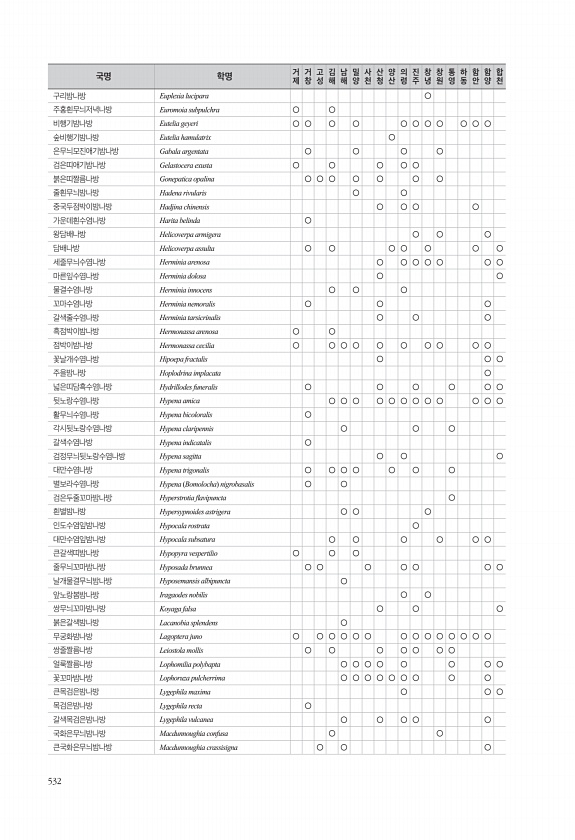532 구리밤나방 Euplexia lucipara ○ 주홍흰무늬저녁나방 Euromoia subpulchra ○ ○ 비행기밤나방 Eutelia geyeri ○ ○ ○ ○ ○ ○ ○ ○ ○ ○ ○ 숲비행기밤나방 Eutelia hamulatrix ○ 은무늬모진애기밤나방 Gabala argentata ○ ○ ○ ○ 검은띠애기밤나방 Gelastocera exusta ○ ○ ○ ○ ○ 붉은띠짤름나방 Gonepatica opalina ○ ○ ○ ○ ○ ○ ○ 줄흰무늬밤나방 Hadena rivularis ○ ○ 중국두점박이밤나방 Hadjina chinensis ○ ○ ○ ○ 가운데흰수염나방 Harita belinda ○ 왕담배나방 Helicoverpa armigera ○ ○ ○ 담배나방 Helicoverpa assulta...