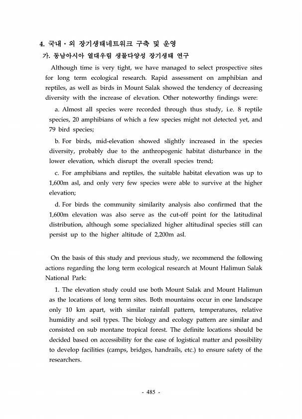485 4. 국내ㆍ외 장기생태네트워크 구축 및 운영 가. 동남아시아 열대우림 생물다양성 장기생태 연구 Although time is very tight, we have managed to select prospective sites for long term ecological research. Rapid assessment on amphibian and reptiles, as well as birds in Mount Salak showed the tendency of decreasing diversity with the increase of elevation. Other noteworthy findings werea. Almost all species were recorded through thus stud...