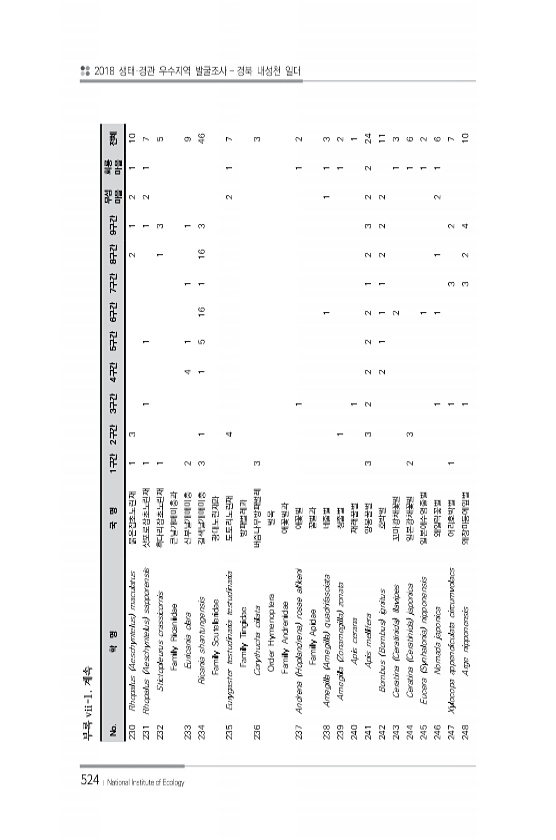 524 No. 학 명 국 명 1구간 2구간 3구간 4구간 5구간 6구간 7구간 8구간 9구간 무섬 마을 회룡 마을 전체 230 Rhopalus Aeschyntelus maculatus 붉은잡초노린재 1 3 2 1 2 1 10 231 Rhopalus Aeschyntelus sapporensis 삿포로잡초노린재 1 1 1 1 2 1 7 232 Stictopleurus crassicornis 흑다리잡초노린재 1 1 3 5 Family Ricaniidae 큰날개매미충과 233 Euricania clara 신부날개매미충 2 4 1 1 1 9 234 Ricania shantungensis 갈색날개매미충 3 1 1 5 16 1 16 3 46 Family Scuteleridae 광대노린재과 235 Eurygaster te...