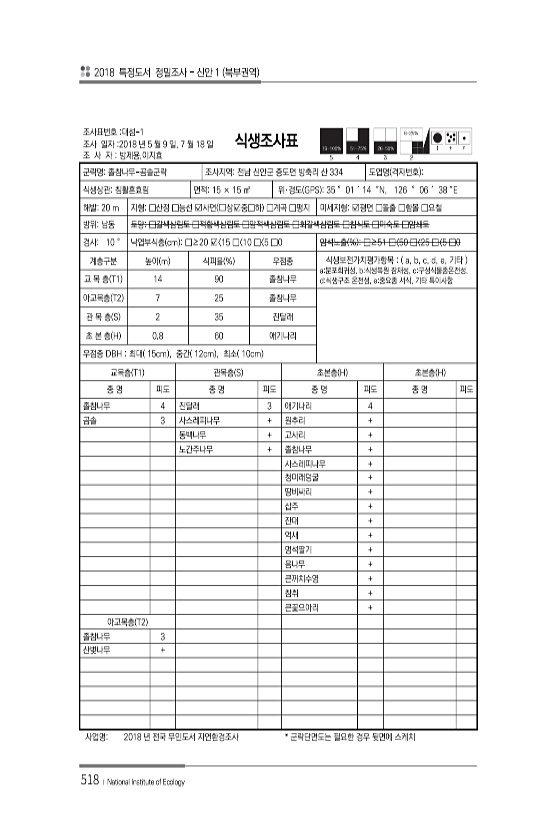 2018 특정도서 정밀조사 신안 1 북부권역 518 ? National Institute of Ecology 조사표번호 대섬-1 조사 일자 2018 년 5 월 9 일, 7 월 18 일 조 사 자 방제용,이지효 식생조사표 군락명졸참나무-곰솔군락 조사지역전남 신안군 증도면 방축리 산 334 도엽명 격자번호 식생상관침활혼효림 면적15 × 15 ㎡ 위·경도 GPS 35 ° 01 ′ 14 ″N, 126 ° 06 ′ 38 ″E 해발20 m 지형□산정 □능선 ?사면 ?상?중□하 □계곡 □평지 미세지형?평면 □돌출 □함몰 □요철 방위남동 토양□갈색삼림토 □적황색삼림토 □암적색삼림토 □회갈색삼림토 □침식토 □미숙토 □암쇄토 경사10 ° 낙엽부식층 cm □≥20 ? 15 □ 10 □ 5 □0 암석노출 % □≥51 □〈50 □...