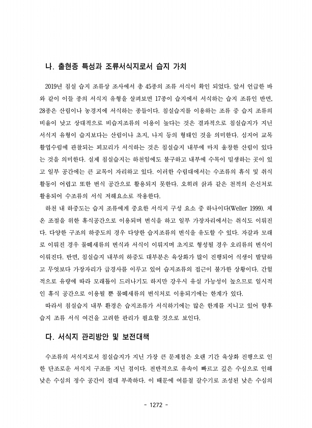 1272 나. 출현종 특성과 조류서식지로서 습지 가치 2019년 침실 습지 조류상 조사에서 총 45종의 조류 서식이 확인 되었다. 앞서 언급한 바 와 같이 이들 종의 서식지 유형을 살펴보면 17종이 습지에서 서식하는 습지 조류인 반면, 28종은 산림이나 농경지에 서식하는 종들이다. 침실습지를 이용하는 조류 중 습지 조류의 비율이 낮고 상대적으로 비습지조류의 이용이 높다는 것은 결과적으로 침실습지가 지닌 서식지 유형이 습지보다는 산림이나 초지, 나지 등의 형태인 것을 의미한다. 심지어 교목 활엽수림에 관찰되는 꾀꼬리가 서식하는 것은 침실습지 내부에 마치 울창한 산림이 있다 는 것을 의미한다. 실제 침실습지는 하천임에도 불구하고 내부에 수목이 밀생하는 곳이 있 고 일부 공간에는 큰 교목이 자리하고 있다. 이러한...
