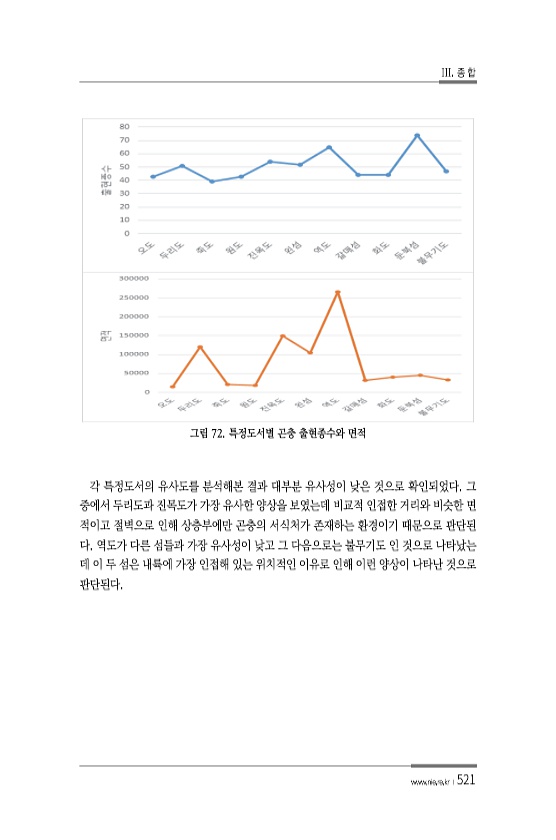 III. 종 합 www.nie.re.kr ?521 그림 72. 특정도서별 곤충 출현종수와 면적 각 특정도서의 유사도를 분석해본 결과 대부분 유사성이 낮은 것으로 확인되었다. 그 중에서 두리도과 진목도가 가장 유사한 양상을 보였는데 비교적 인접한 거리와 비슷한 면 적이고 절벽으로 인해 상층부에만 곤충의 서식처가 존재하는 환경이기 때문으로 판단된 다. 역도가 다른 섬들과 가장 유사성이 낮고 그 다음으로는 불무기도 인 것으로 나타났는 데 이 두 섬은 내륙에 가장 인접해 있는 위치적인 이유로 인해 이런 양상이 나타난 것으로판단된다.