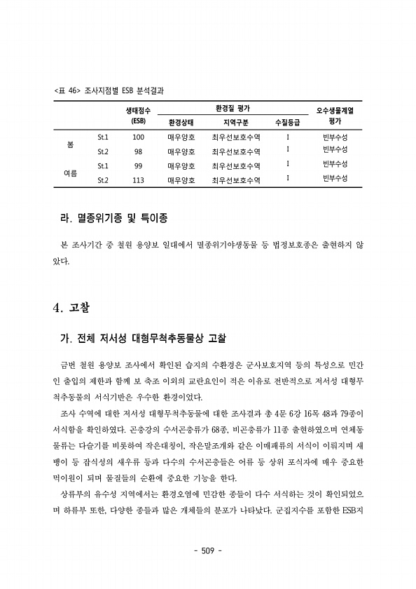 509 생태점수 ESB 환경질 평가 오수생물계열 환경상태 지역구분 수질등급 평가 봄 St.1 100 매우양호 최우선보호수역 I 빈부수성 St.2 98 매우양호 최우선보호수역 I 빈부수성 여름 St.1 99 매우양호 최우선보호수역 I 빈부수성 St.2 113 매우양호 최우선보호수역 I 빈부수성 표 46 조사지점별 분석결과 ESB 본 조사기간 중 철원 용양보 일대에서 멸종위기야생동물 등 법정보호종은 출현하지 않 았다. 금번 철원 용양보 조사에서 확인된 습지의 수환경은 군사보호지역 등의 특성으로 민간 인 출입의 제한과 함께 보 축조 이외의 교란요인이 적은 이유로 전반적으로 저서성 대형무 척추동물의 서식기반은 우수한 환경이었다. 조사 수역에 대한 저서성 대형무척추동물에 대한 조사결과 총 문 강 목 과 종이 4 6 ...
