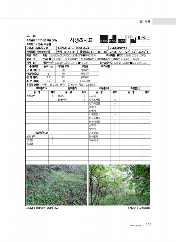Ⅲ. 부록 www.nie.re.kr ? 525 No 10 조사일자 2016년 8월 30일 조사자 서형수, 이응필 식생조사표 군락명가래나무군락 조사지역양구군 감우골 계곡부 도엽명 격자번호 식생상관낙엽활엽수림 면적10 × 5 ㎡ 위·경도 GPS 38° 16′ 27.96″N, 127° 52′ 39.45″E 해발480m 지형□산정□능선□사면 □상□중□하 ■계곡□평지 미세지형■평면 □돌출 □함몰 □요철 방위NE 토양■갈색삼림토 □적황색삼림토 □암적색삼림토 □회갈색삼림토 □침식토 □미숙토 □암쇄토 경사13° 낙엽부식층□≥20 □ 15 □ 10 ■ 5 □0 암석노출 % □≥51 □ 50 ■ 25 □ 5 □0 층위구분 높이 m 식피율 % 우점종 특기사항 교 목 층 T1 16 70 가래나무 아교목층 T2 6 40 산뽕나무 ...