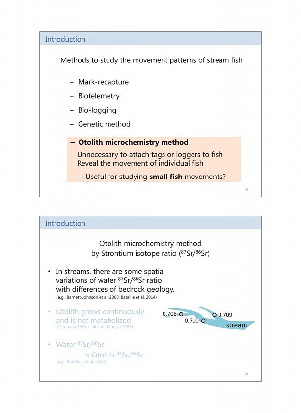? Otolith grows continuously and is not metabolized ? In streams, there are some spatial variations of water 87Sr/86Sr ratio with differences of bedrock geology. Otolith microchemistry method by Strontium isotope ratio 87Sr/86Sr Introduction ? Water 87Sr/86Sr ≒ Otolith 87Sr/86Sr e.g., Barnett-Johnson et al. 2008; Bataille et al. 2014 Campana 1983; Ichii and Mugiya 1983 e.g., Muhlfeld et al. 2012 0...