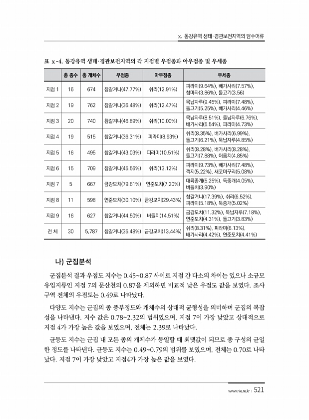 x. 동강유역 생태·경관보전지역의 담수어류 www.nie.re.kr ?521 총 종수 총 개체수 우점종 아우점종 우세종 지점 1 16 674 참갈겨니 47.77% 쉬리 12.91% 피라미 9.64% , 배가사리 7.57% , 참마자 3.86% , 돌고기 3.56 지점 2 19 762 참갈겨니 36.48% 쉬리 12.47% 묵납자루 9.45% , 피라미 7.48% , 돌고기 5.25% , 배가사리 4.46% 지점 3 20 740 참갈겨니 46.89% 쉬리 10.00% 묵납자루 8.51% , 줄납자루 6.76% , 배가사리 5.54% , 피라미 4.73% 지점 4 19 515 참갈겨니 36.31% 피라미 8.93% 쉬리 8.35% , 배가사리 6.99% , 돌고기 6.21% , 묵납자루 4.85% 지점 5 16...