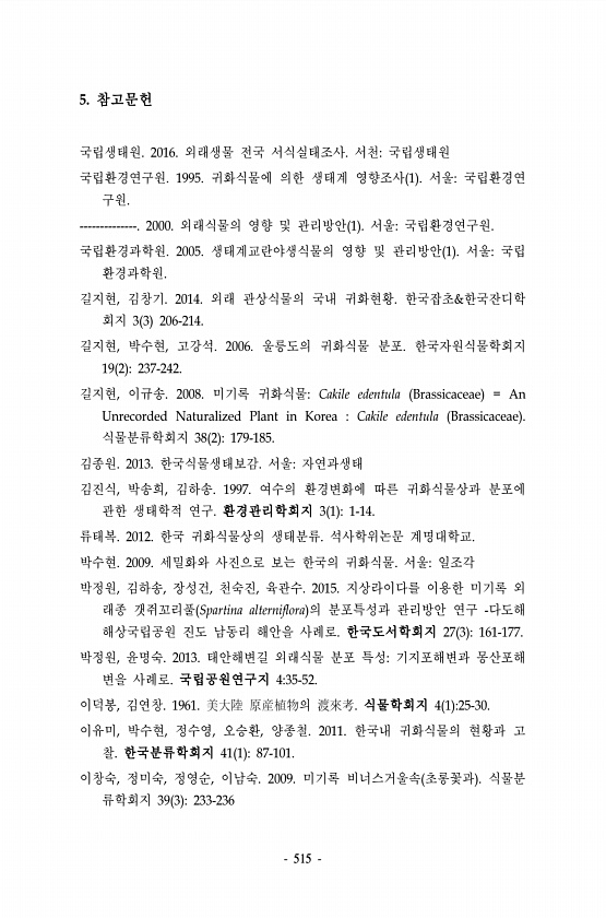515 5. 참고문헌 국립생태원. 2016. 외래생물 전국 서식실태조사. 서천국립생태원 국립환경연구원. 1995. 귀화식물에 의한 생태계 영향조사 1 서울국립환경연 구원. --------------. 2000. 외래식물의 영향 및 관리방안 1 서울국립환경연구원. 국립환경과학원. 2005. 생태계교란야생식물의 영향 및 관리방안 1 서울국립 환경과학원. 길지현, 김창기. 2014. 외래 관상식물의 국내 귀화현황. 한국잡초&한국잔디학 회지 3 3 206-214. 길지현, 박수현, 고강석. 2006. 울릉도의 귀화식물 분포. 한국자원식물학회지 19 2 237-242. 길지현, 이규송. 2008. 미기록 귀화식물Cakile edentula Brassicaceae = An Unrecorded Naturalized Pl...