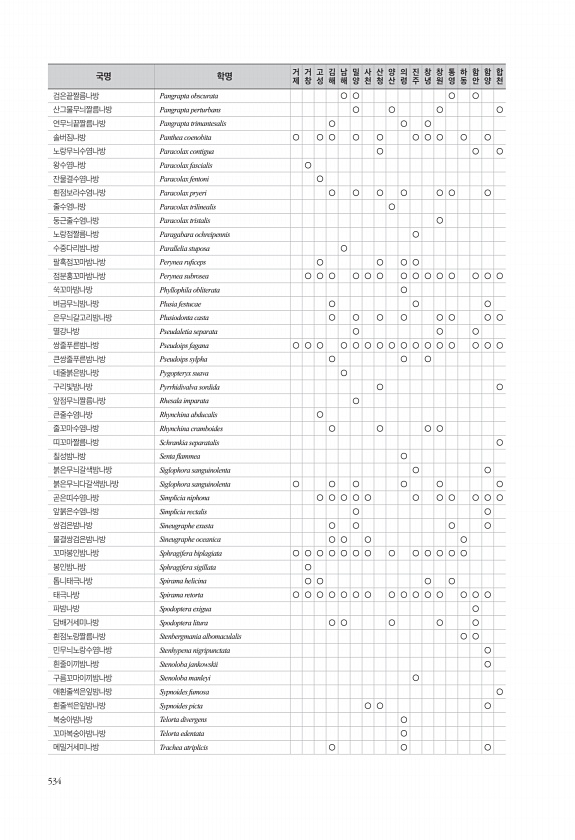 534 검은끝짤름나방 Pangrapta obscurata ○ ○ ○ ○ 산그물무늬짤름나방 Pangrapta perturbans ○ ○ ○ ○ 연무늬끝짤름나방 Pangrapta trimantesalis ○ ○ ○ 솔버짐나방 Panthea coenobita ○ ○ ○ ○ ○ ○ ○ ○ ○ ○ 노랑무늬수염나방 Paracolax contigua ○ ○ ○ 왕수염나방 Paracolax fascialis ○ 잔물결수염나방 Paracolax fentoni ○ 흰점보라수염나방 Paracolax pryeri ○ ○ ○ ○ ○ ○ ○ 줄수염나방 Paracolax trilinealis ○ 둥근줄수염나방 Paracolax tristalis ○ 노랑점짤름나방 Paragabara ochreipennis ○ 수중다리밤나방 Parall...