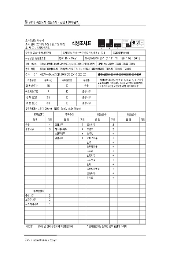 2018 특정도서 정밀조사 신안 1 북부권역 520 ? National Institute of Ecology 조사표번호 대섬-3 조사 일자 2018 년 5 월 9 일, 7 월 18 일 조 사 자 방제용,이지효 식생조사표 군락명곰솔-졸참나무군락 조사지역전남 신안군 증도면 방축리 산 334 도엽명 격자번호 식생상관침활혼효림 면적15 × 15 ㎡ 위·경도 GPS 35 ° 01 ′ 11 ″N, 126 ° 06 ′ 36 ″E 해발45 m 지형□산정 □능선 ?사면 ?상?중□하 □계곡 □평지 미세지형?평면 □돌출 □함몰 □요철 방위북동 토양□갈색삼림토 □적황색삼림토 □암적색삼림토 □회갈색삼림토 □침식토 □미숙토 □암쇄토 경사10 ° 낙엽부식층 cm □≥20 ? 15 □ 10 □ 5 □0 암석노출 % □≥51 □〈50 □...