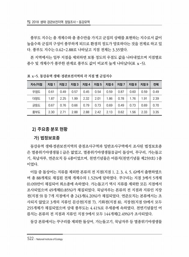 2018 생태·경관보전지역 정밀조사 동강유역 522 ? National Institute of Ecology 풍부도 지수는 총 개체수와 총 종수만을 가지고 군집의 상태를 표현하는 지수로서 값이 높을수록 군집의 구성이 풍부하게 되므로 환경의 정도가 양호하다는 것을 전제로 하고 있 다. 풍부도 지수는 0.622.88로 나타났고 지점 전체는 3.35였다. 본 지역에서는 일부 지점을 제외하면 보통 정도의 우점도 값을 나타내었으며 지점별로 종수 및 개체수가 풍부한 관계로 풍부도 값이 비교적 높게 나타났다 표 ⅹ-5 지수/지점 지점 1 지점 2 지점 3 지점 4 지점 5 지점 6 지점 7 지점 8 지점 9 전체 우점도 0.61 0.49 0.57 0.45 0.54 0.59 0.87 0.60 0.59 0.49 다양도 1....