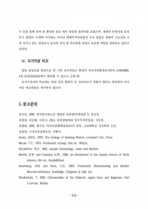 510 수 등을 통해 살펴 본 환경의 질은 매우 양호한 결과치를 보였으며 생태적 안정성을 보여 , 주고 있었다 수계에 서식하는 저서성 대형무척추동물의 주요 종들은 생태적 기능성을 크 게 가지고 있는 종들로서 습지의 유지 및 먹이관계 속에서 중요한 역할을 담당하고 있다고 보인다. 철원 용양보를 대상으로 한 기존 조사자료는 환경부 전국자연환경조사 차 금화 3 2008 , 4 2014 차 남대천 에서 찾아볼 수 있으나 금번 95 조사구간과의 비교에는 대상 공간 불일치 등 자료비교가 적합지 않다고 판단하여 과거 자료 비교내용을 제시하지 않는다. 권오길 한국동식물도감 제 권 동물편 연체동물 문교부 , 1990, 32 I , 김명철 천승필 이존국 하천생태계와 담수무척추동물 지오북 , , , 2013, , 송광래 한국산...