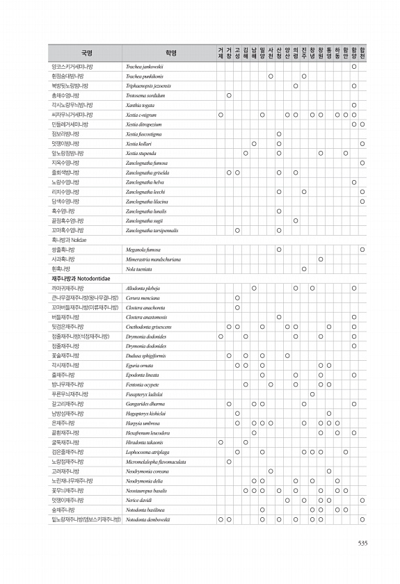 535 양코스키거세미나방 Trachea jankowskii ○ 흰점숨대밤나방 Trachea punkikonis ○ ○ 북방뒷노랑밤나방 Triphaenopsis jezoensis ○ ○ 총채수염나방 Trotosema sordidum ○ 각시노랑무늬밤나방 Xanthia togata ○ 씨자무늬거세미나방 Xestia c-nigrum ○ ○ ○ ○ ○ ○ ○ ○ ○ 민들레거세미나방 Xestia ditrapezium ○ ○ 점보라밤나방 Xestia fuscostigma ○ 멋쟁이밤나방 Xestia kollari ○ ○ ○ 앞노랑점밤나방 Xestia stupenda ○ ○ ○ ○ 지옥수염나방 Zanclognatha fumosa ○ 줄회색밤나방 Zanclognatha griselda ○ ○ ○ ○ 노랑수염나방 Zancl...