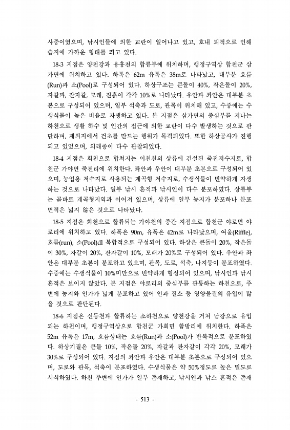 사중이였으며, 낚시인들에 의한 교란이 일어나고 있고, 호내 퇴적으로 인해 습지에 가까운 형태를 띄고 있다. 18-3 지점은 양천강과 용흥천의 합류부에 위치하며, 행정구역상 합천군 삼 가면에 위치하고 있다. 하폭은 62m 유폭은 38m로 나타났고, 대부분 흐름 Run 과 소 Pool 로 구성되어 있다. 하상구조는 큰돌이 40%, 작은돌이 20%, 자갈과, 잔자갈, 모래, 진흙이 각각 10%로 나타났다. 우안과 좌안은 대부분 초 본으로 구성되어 있으며, 일부 석축과 도로, 관목이 위치해 있고, 수중에는 수 생식물이 높은 비율로 자생하고 있다. 본 지점은 삼가면의 중심부를 지나는 하천으로 생활 하수 및 인간의 접근에 의한 교란이 다수 발생하는 것으로 판 단하며, 제외지에서 건초를 만드는 행위가 목격되었다. 또한 ...