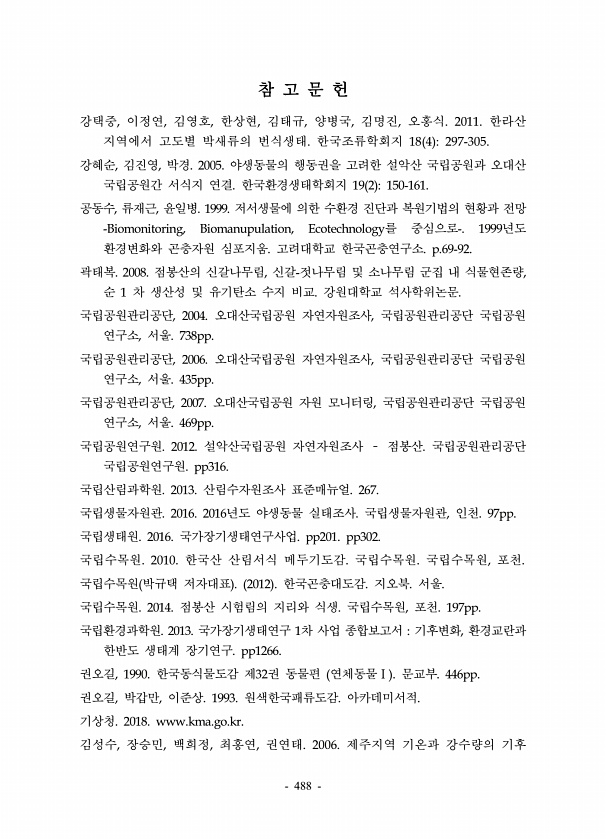 488 참 고 문 헌 강택중, 이정연, 김영호, 한상현, 김태규, 양병국, 김명진, 오홍식. 2011. 한라산 지역에서 고도별 박새류의 번식생태. 한국조류학회지 18 4 297-305. 강혜순, 김진영, 박경. 2005. 야생동물의 행동권을 고려한 설악산 국립공원과 오대산 국립공원간 서식지 연결. 한국환경생태학회지 19 2 150-161. 공동수, 류재근, 윤일병. 1999. 저서생물에 의한 수환경 진단과 복원기법의 현황과 전망 -Biomonitoring, Biomanupulation, Ecotechnology를 중심으로-. 1999년도 환경변화와 곤충자원 심포지움. 고려대학교 한국곤충연구소. p.69-92. 곽태복. 2008. 점봉산의 신갈나무림, 신갈-젓나무림 및 소나무림 군집 내 식물현존량, 순 1 차...