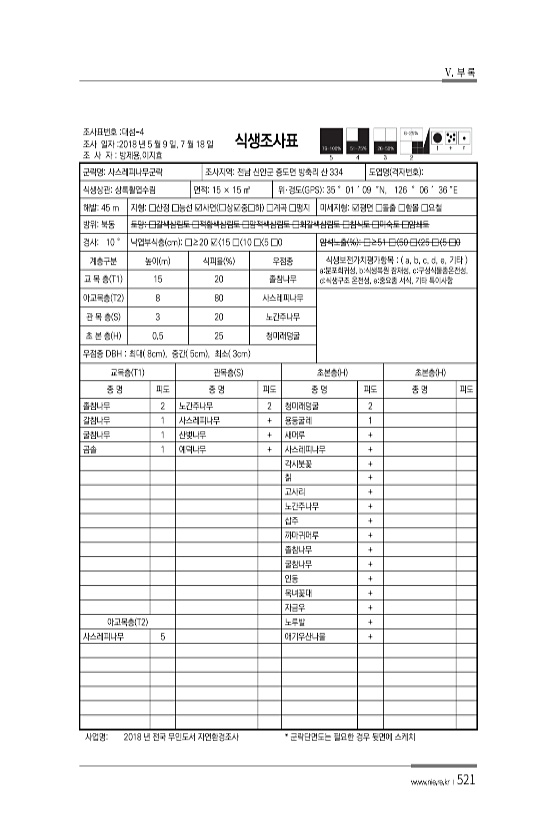 V. 부 록 www.nie.re.kr ?521 조사표번호 대섬-4 조사 일자 2018 년 5 월 9 일, 7 월 18 일 조 사 자 방제용,이지효 식생조사표 군락명사스레피나무군락 조사지역전남 신안군 증도면 방축리 산 334 도엽명 격자번호 식생상관상록활엽수림 면적15 × 15 ㎡ 위·경도 GPS 35 ° 01 ′ 09 ″N, 126 ° 06 ′ 36 ″E 해발45 m 지형□산정 □능선 ?사면 ?상?중□하 □계곡 □평지 미세지형?평면 □돌출 □함몰 □요철 방위북동 토양□갈색삼림토 □적황색삼림토 □암적색삼림토 □회갈색삼림토 □침식토 □미숙토 □암쇄토 경사10 ° 낙엽부식층 cm □≥20 ? 15 □ 10 □ 5 □0 암석노출 % □≥51 □〈50 □〈25 □〈5 □0 계층구분 높이 m 식피율 % 우점종 식생보전...