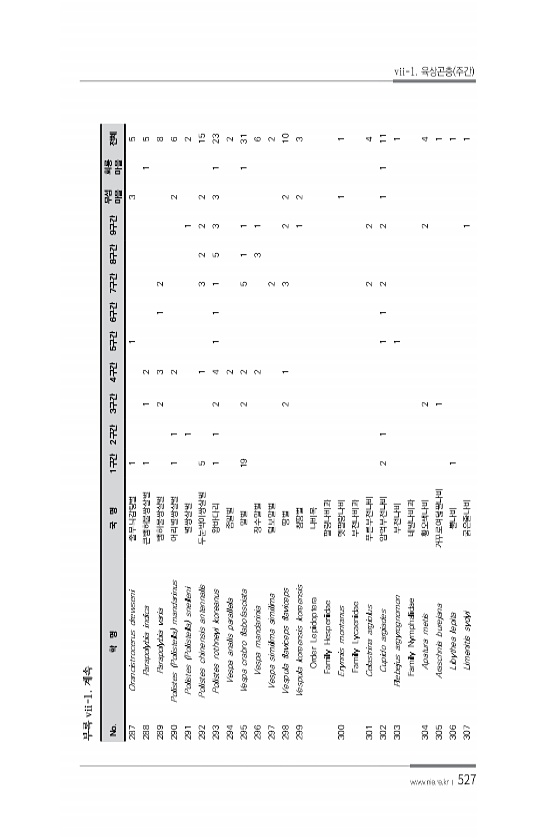 527 No. 학 명 국 명 1구간 2구간 3구간 4구간 5구간 6구간 7구간 8구간 9구간 무섬 마을 회룡 마을 전체 287 Orancistrocerus drewseni 줄무늬감탕벌 1 1 3 5 288 Parapolybia indica 큰뱀허물쌍살벌 1 1 2 1 5 289 Parapolybia varia 뱀허물쌍살벌 2 3 1 2 8 290 Polistes Polistella mandarinus 어리별쌍살벌 1 1 2 2 6 291 Polistes Polistella snelleni 별쌍살벌 1 1 2 292 Polistes chinensis antennalis 두눈박이쌍살벌 5 1 3 2 2 2 15 293 Polistes rothneyi koreanus 왕바다리 1 1 2 4 1 1 1 5 3 3 ...