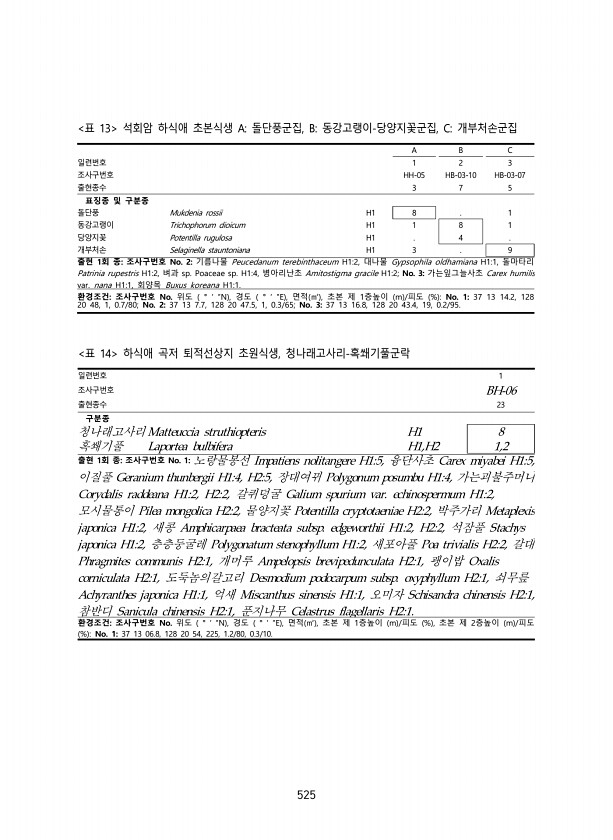 525 A B C 일련번호 1 2 3 조사구번호 HH-05 HB-03-10 HB-03-07 출현종수 3 7 5 표징종 및 구분종 돌단풍 Mukdenia rossii H1 8 1 동강고랭이 Trichophorum dioicum H1 1 8 1 당양지꽃 Potentilla rugulosa H1 4 개부처손 Selaginella stauntoniana H1 3 9 출현 1회 종조사구번호 No. 2기름나물 Peucedanum terebinthaceum H12, 대나물 Gypsophila oldhamiana H11, 돌마타리 Patrinia rupestris H12, 벼과 sp. Poaceae sp. H14, 병아리난초 Amitostigma gracile H12; No. 3가는잎그늘사초 Carex humilis va...