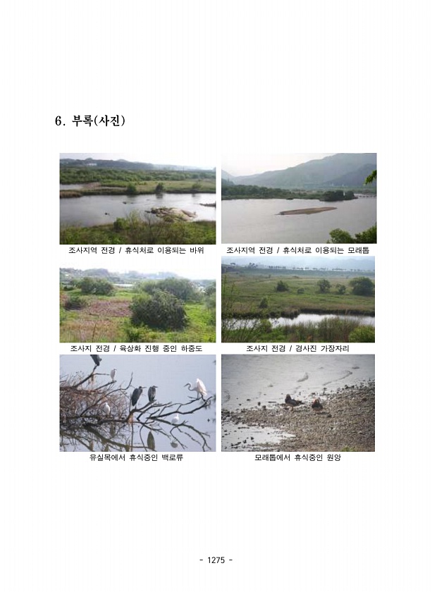 1275 6. 부록 사진 조사지역 전경 휴식처로 이용되는 바위 조사지역 전경 휴식처로 이용되는 모래톱 조사지 전경 육상화 진행 중인 하중도 조사지 전경 경사진 가장자리 유실목에서 휴식중인 백로류 모래톱에서 휴식중인원앙