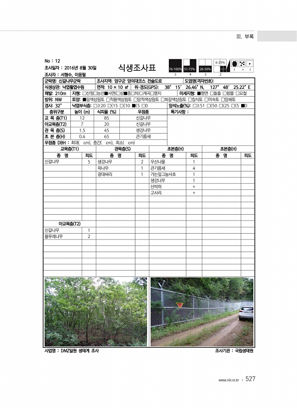 Ⅲ. 부록 www.nie.re.kr ? 527 No 12 조사일자 2016년 8월 30일 조사자 서형수, 이응필 식생조사표 군락명신갈나무군락 조사지역양구군 양의대코스 전술도로 도엽명 격자번호 식생상관낙엽활엽수림 면적10 × 10 ㎡ 위·경도 GPS 38° 15′ 26.46″N, 127° 48′ 25.22″E 해발210m 지형□산정□능선■사면 □상■중□하 □계곡□평지 미세지형■평면 □돌출 □함몰 □요철 방위NW 토양■갈색삼림토 □적황색삼림토 □암적색삼림토 □회갈색삼림토 □침식토 □미숙토 □암쇄토 경사32° 낙엽부식층□≥20 □ 15 □ 10 ■ 5 □0 암석노출 % □≥51 □ 50 □ 25 □ 5 ■0 층위구분 높이 m 식피율 % 우점종 특기사항 교 목 층 T1 12 85 신갈나무 아교목층 T2 7 20 신...