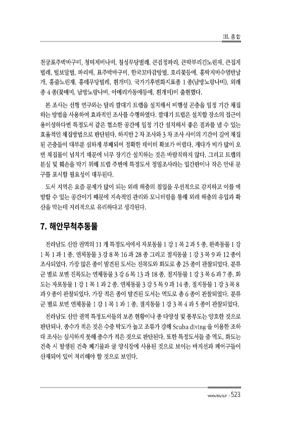 III. 종 합 www.nie.re.kr ?523 천궁표주박바구미, 청띠제비나비, 칠성무당벌레, 큰검정파리, 큰딱부리긴노린재, 큰집게 벌레, 털보말벌, 파리매, 표주박바구미, 한국꼬마감탕벌, 호리꽃등에, 홍딱지바수염반날 개, 홍줄노린재, 홍테무당벌레, 흰개미 , 국가기후변화지표종 1 종 남방노랑나비 , 외래 종 4 종 꽃매미, 남방노랑나비, 아메리카동애등에, 흰개미 이 출현했다. 본 조사는 선행 연구와는 달리 깔대기 트랩을 설치해서 비행성 곤충을 일정 기간 채집 하는 방법을 사용하여 효과적인 조사를 수행하였다. 깔대기 트랩은 설치할 장소의 접근이 용이성하다면 특정도서 같은 협소한 공간에 일정 기간 설치해서 좋은 결과를 낼 수 있는 효율적인 채집방법으로 판단된다. 하지만 2 차 조사와 3 차 조사 사이의 기간...