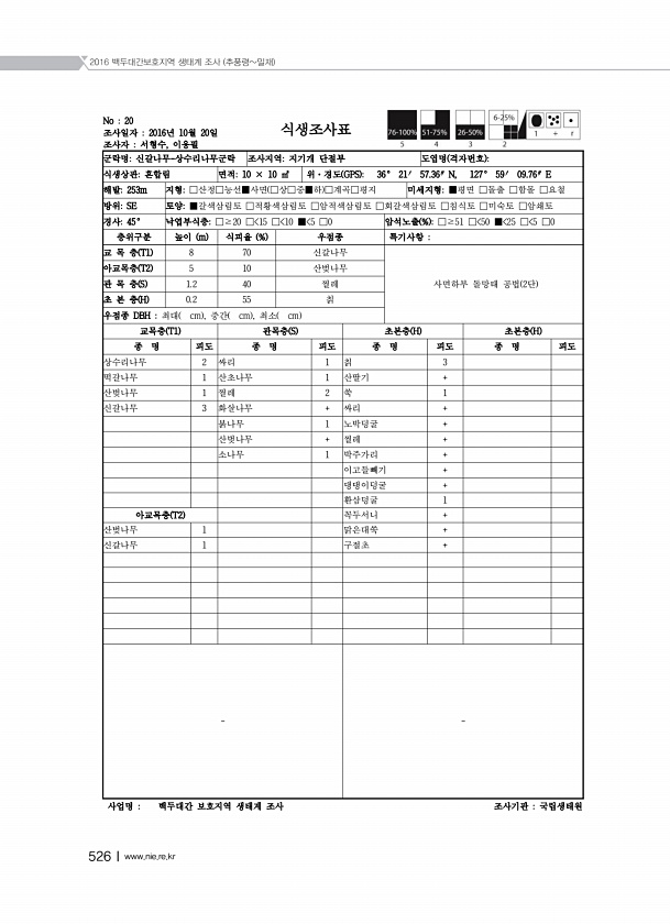2016 백두대간보호지역 생태계 조사 추풍령밀재 526Ⅰwww.nie.re.kr No 20 조사일자 2016년 10월 20일 조사자 서형수, 이응필 식생조사표 군락명신갈나무-상수리나무군락 조사지역지기개 단절부 도엽명 격자번호 식생상관혼합림 면적10 × 10 ㎡ 위·경도 GPS 36° 21′ 57.36″ N, 127° 59′ 09.76″ E 해발253m 지형□산정□능선■사면 □상□중■하 □계곡□평지 미세지형■평면 □돌출 □함몰 □요철 방위SE 토양■갈색삼림토 □적황색삼림토 □암적색삼림토 □회갈색삼림토 □침식토 □미숙토 □암쇄토 경사45° 낙엽부식층□≥20 □ 15 □ 10 ■ 5 □0 암석노출 % □≥51 □ 50 ■ 25 □ 5 □0 층위구분 높이 m 식피율 % 우점종 특기사항 교 목 층 T1 8 70 신갈...