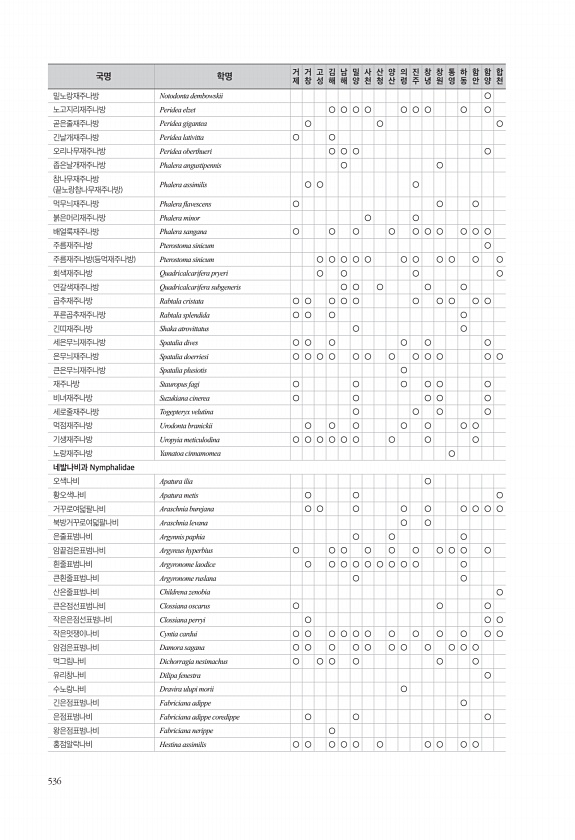 536 밑노랑재주나방 Notodonta dembowskii ○ 노고지리재주나방 Peridea elzet ○ ○ ○ ○ ○ ○ ○ ○ ○ 곧은줄재주나방 Peridea gigantea ○ ○ ○ 긴날개재주나방 Peridea lativitta ○ ○ 오리나무재주나방 Peridea oberthueri ○ ○ ○ ○ 좁은날개재주나방 Phalera angustipennis ○ ○ 참나무재주나방 끝노랑참나무재주나방 Phalera assimilis ○ ○ ○ 먹무늬재주나방 Phalera favescens ○ ○ ○ 붉은머리재주나방 Phalera minor ○ ○ 배얼룩재주나방 Phalera sangana ○ ○ ○ ○ ○ ○ ○ ○ ○ ○ 주름재주나방 Pterostoma sinicum ○ 주름재주나방 등먹재주나방 Pter...