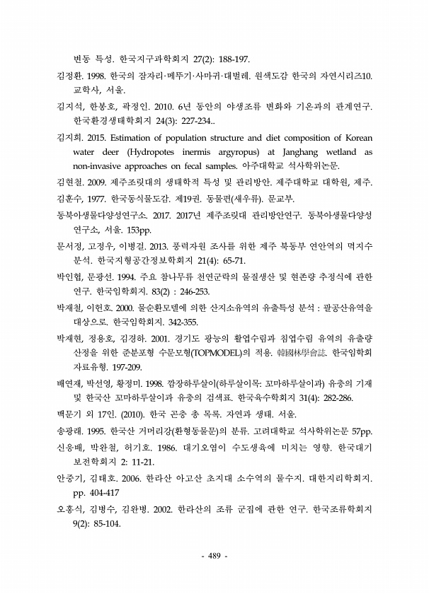 489 변동 특성. 한국지구과학회지 27 2 188-197. 김정환. 1998. 한국의 잠자리·메뚜기·사마귀·대벌레. 원색도감 한국의 자연시리즈10. 교학사, 서울. 김지석, 한봉호, 곽정인. 2010. 6년 동안의 야생조류 변화와 기온과의 관계연구. 한국환경생태학회지 24 3 227-234.. 김지희. 2015. Estimation of population structure and diet composition of Korean water deer Hydropotes inermis argyropus at Janghang wetland as non-invasive approaches on fecal samples. 아주대학교 석사학위논문. 김현철. 2009. 제주조릿대의 생태학적 특성 및 관리방안. 제주대학...