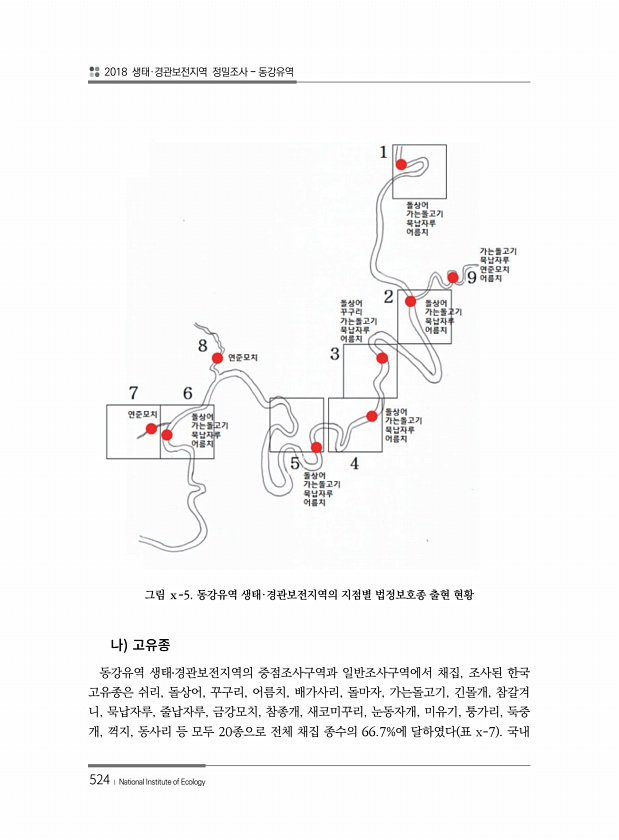 2018 생태·경관보전지역 정밀조사 동강유역 524 ? National Institute of Ecology 그림 ⅹ-5. 동강유역 생태·경관보전지역의 지점별 법정보호종 출현 현황 동강유역 생태?경관보전지역의 중점조사구역과 일반조사구역에서 채집, 조사된 한국 고유종은 쉬리, 돌상어, 꾸구리, 어름치, 배가사리, 돌마자, 가는돌고기, 긴몰개, 참갈겨 니, 묵납자루, 줄납자루, 금강모치, 참종개, 새코미꾸리, 눈동자개, 미유기, 퉁가리, 둑중 개, 꺽지, 동사리 등 모두 20종으로 전체 채집 종수의 66.7%에 달하였다 표 x-7국내