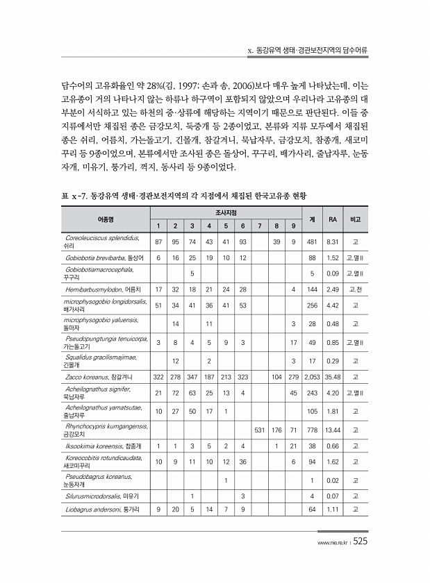x. 동강유역 생태·경관보전지역의 담수어류 www.nie.re.kr ?525 담수어의 고유화율인 약 28% 김, 1997; 손과 송, 2006 보다 매우 높게 나타났는데, 이는 고유종이 거의 나타나지 않는 하류나 하구역이 포함되지 않았으며 우리나라 고유종의 대 부분이 서식하고 있는 하천의 중·상류에 해당하는 지역이기 때문으로 판단된다. 이들 중 지류에서만 채집된 종은 금강모치, 둑중개 등 2종이었고, 본류와 지류 모두에서 채집된 종은 쉬리, 어름치, 가는돌고기, 긴몰개, 참갈겨니, 묵납자루, 금강모치, 참종개, 새코미 꾸리 등 9종이었으며, 본류에서만 조사된 종은 돌상어, 꾸구리, 배가사리, 줄납자루, 눈동 자개, 미유기, 퉁가리, 꺽지, 동사리 등 9종이었다. 어종명 조사지점 계 RA 비고 1 2 3 4 ...