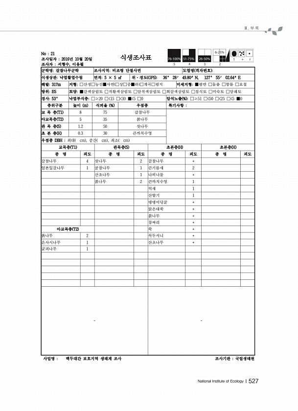 Ⅲ. 부 록 National Institute of EcologyⅠ527 No 21 조사일자 2016년 10월 20일 조사자 서형수, 이응필 식생조사표 군락명갈참나무군락 조사지역비조령 단절사면 도엽명 격자번호 식생상관낙엽활엽수림 면적5 × 5 ㎡ 위·경도 GPS 36° 28′ 49.80″ N, 127° 55′ 02.64″ E 해발317m 지형□산정□능선■사면 □상□중■하 □계곡□평지 미세지형■평면 □돌출 □함몰 □요철 방위ES 토양■갈색삼림토 □적황색삼림토 □암적색삼림토 □회갈색삼림토 □침식토 □미숙토 □암쇄토 경사53° 낙엽부식층□≥20 □ 15 □ 10 ■ 5 □0 암석노출 % □≥51 □ 50 □ 25 □ 5 ■0 층위구분 높이 m 식피율 % 우점종 특기사항 교 목 층 T1 8 75 갈참나무 아교목층 ...
