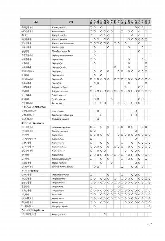 537 흑백알락나비 Hestina japonica ○ ○ ○ ○ ○ ○ 청띠신선나비 Kaniska canace ○ ○ ○ ○ ○ ○ ○ ○ ○ ○ ○ 줄나비 Limenitis camilla ○ ○ ○ ○ ○ ○ 제이줄나비 Limenitis doerriesi ○ ○ ○ ○ ○ ○ ○ ○ ○ ○ 제일줄나비 Limenitis helmanni marinus ○ ○ ○ ○ ○ ○ ○ ○ ○ ○ 굵은줄나비 Limenitis sydyi ○ ○ ○ ○ 은판나비 Mimathyma schrenckii ○ ○ 구름표범나비 Nephargynnis anadyomene ○ 왕세줄나비 Neptis alwina ○ ○ ○ ○ ○ 세줄나비 Neptis philyra ○ ○ ○ 참세줄나비 Neptis philyroides ○ ○ ○ 별박이...