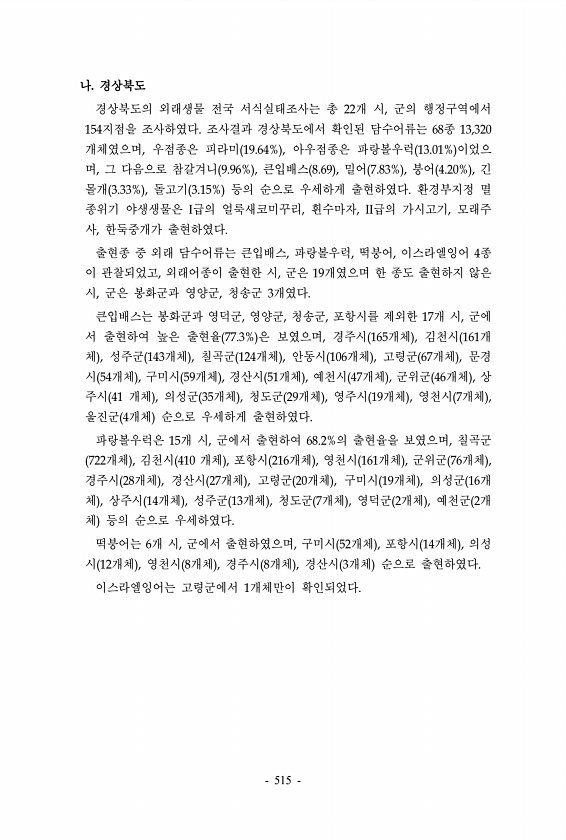 나. 경상북도 경상북도의 외래생물 전국 서식실태조사는 총 22개 시, 군의 행정구역에서 154지점을 조사하였다. 조사결과 경상북도에서 확인된 담수어류는 68종 13,320 개체였으며, 우점종은 피라미 19.64% , 아우점종은 파랑볼우럭 13.01% 이었으 며, 그 다음으로 참갈겨니 9.96% , 큰입배스 8.69 , 밀어 7.83% , 붕어 4.20% , 긴 몰개 3.33% , 돌고기 3.15% 등의 순으로 우세하게 출현하였다. 환경부지정 멸 종위기 야생생물은 I급의 얼룩새코미꾸리, 흰수마자, II급의 가시고기, 모래주 사, 한둑중개가 출현하였다. 출현종 중 외래 담수어류는 큰입배스, 파랑볼우럭, 떡붕어, 이스라엘잉어 4종 이 관찰되었고, 외래어종이 출현한 시, 군은 19개였으며 한 종도 출현하지 않은 시...