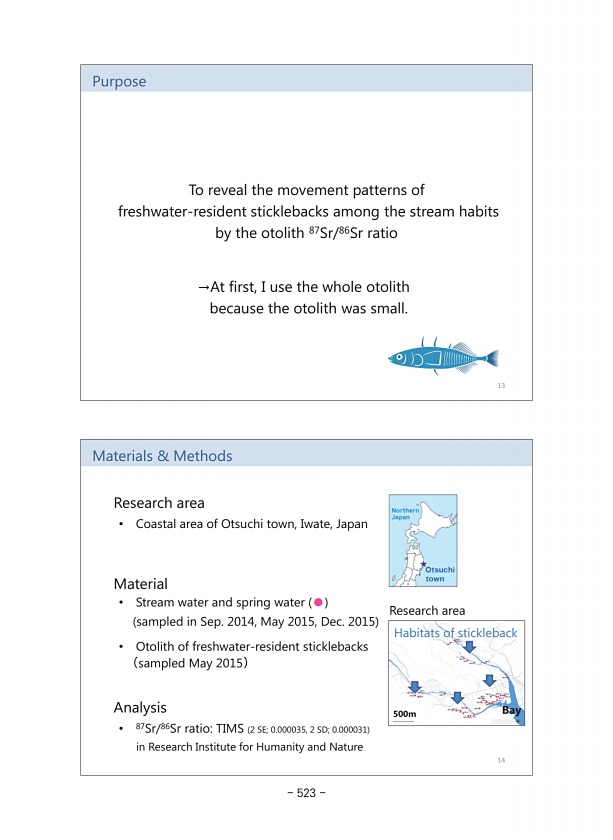 Research area Materials & Methods ? Coastal area of Otsuchi town, Iwate, Japan Material ? Stream water and spring water ● sampled in Sep. 2014, May 2015, Dec. 2015 ? Otolith of freshwater-resident sticklebacks (sampled May 2015) Analysis ? 87Sr/86Sr ratioTIMS 2 SE; 0.000035, 2 SD; 0.000031 in Research Institute for Humanity and Nature 500m Bay Habitats of stickleback Research area 14 13 Purpose →A...