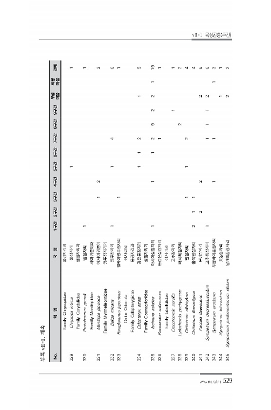 529 No. 학 명 국 명 1구간 2구간 3구간 4구간 5구간 6구간 7구간 8구간 9구간 무섬 마을 회룡 마을 전체 Family Chrysopidae 풀잠자리과 329 Chrysopa intima 풀잠자리 1 1 Family Corydalidae 뱀잠자리과 330 Protohermes grandi 뱀잠자리 1 1 Family Mantispidae 사마귀붙이과 331 Mantispa japonica 애사마귀붙이 1 2 3 Family Myrmeleontidae 명주잠자리과 332 Baliga micans 명주잠자리 1 1 4 6 333 Paraglenurus japonicus 별박이명주잠자리 1 1 Order Odonata 잠자리목 Family Calopterygidae 물잠자리과 334 Caloptery...